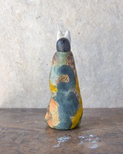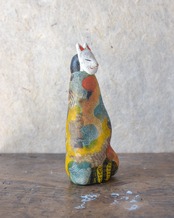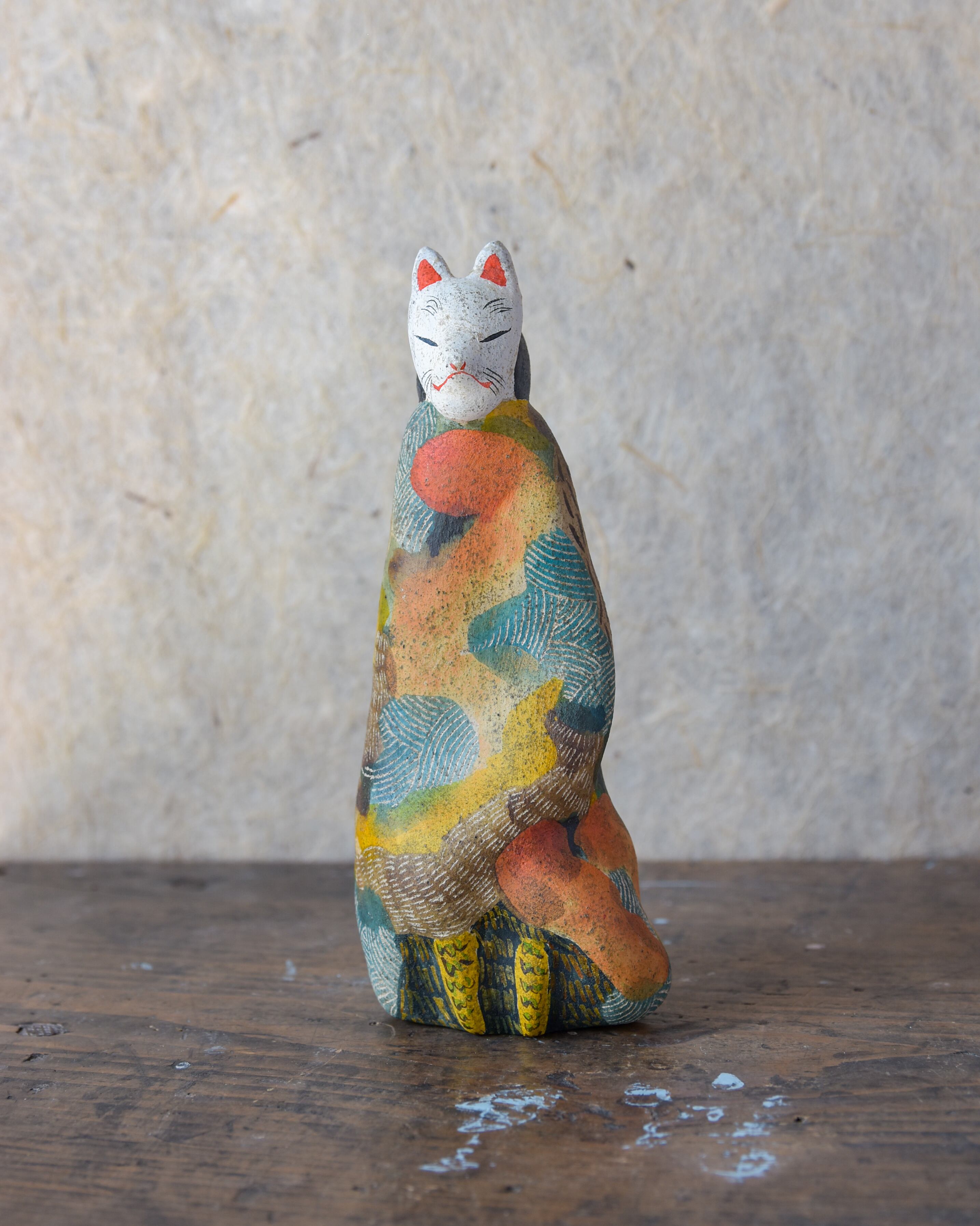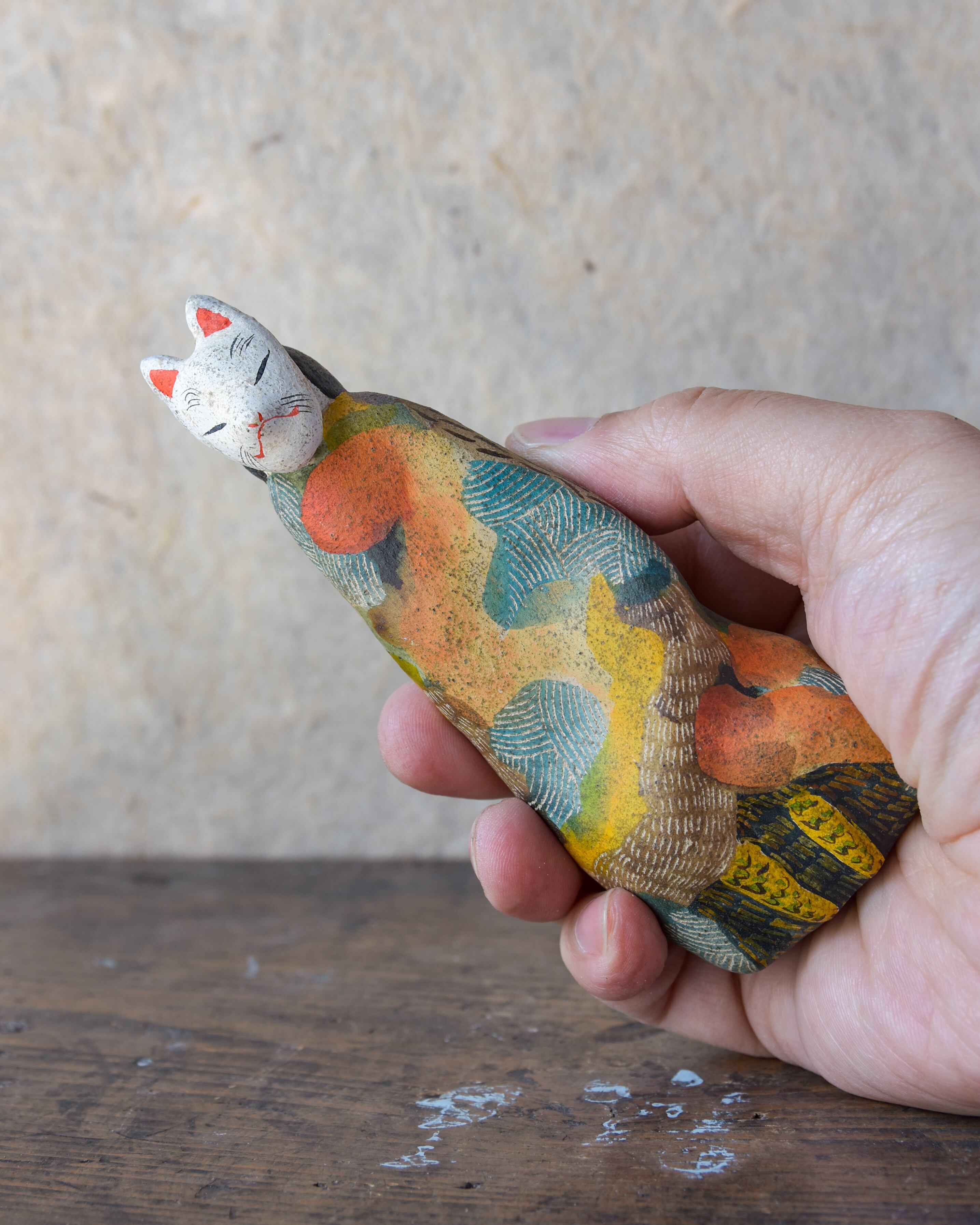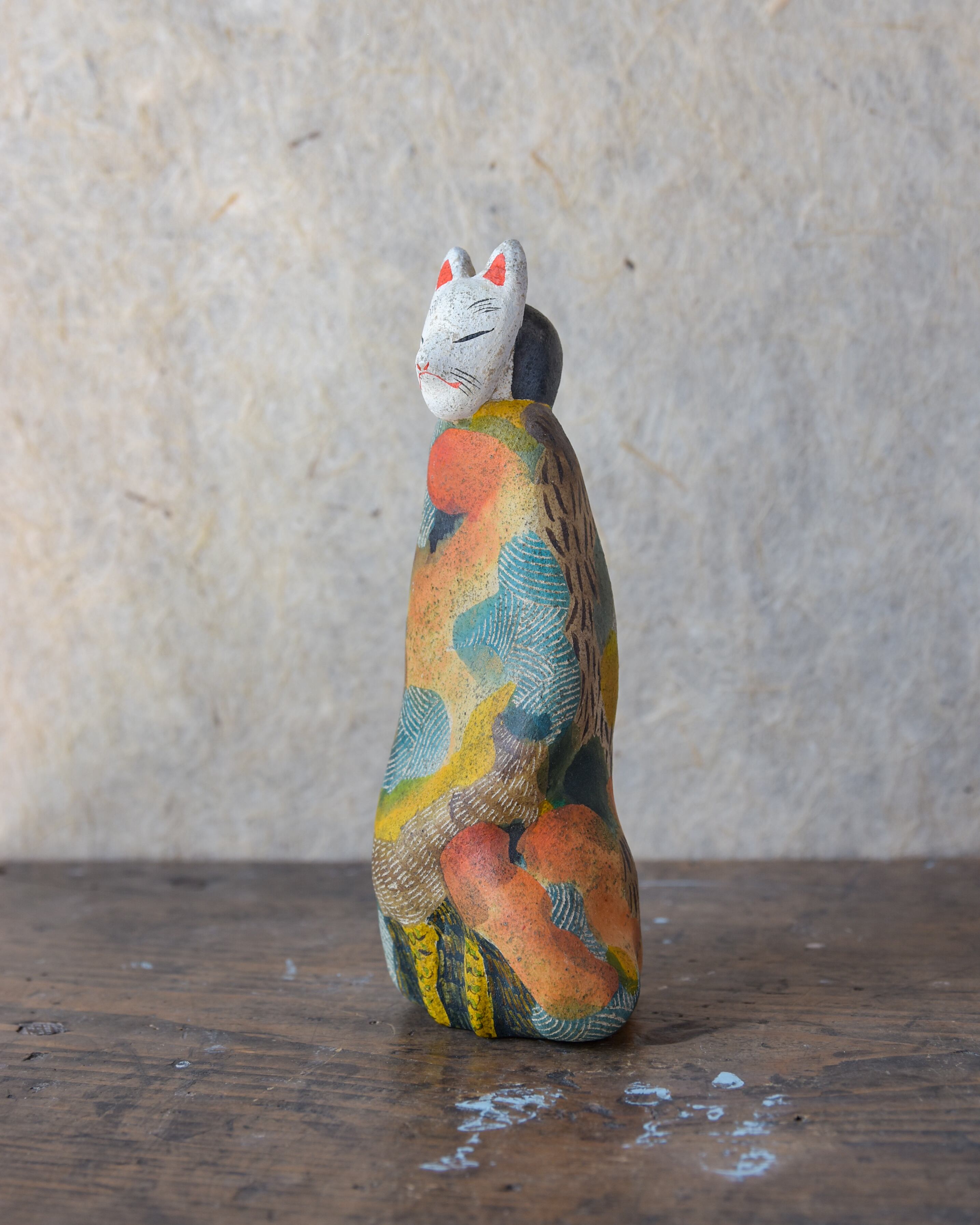 オーブン陶土で造形後、焼成し、絵を描く際と同じ画材を用いて彩色、削りを入れ完成させたオリジナル土人形です。