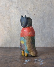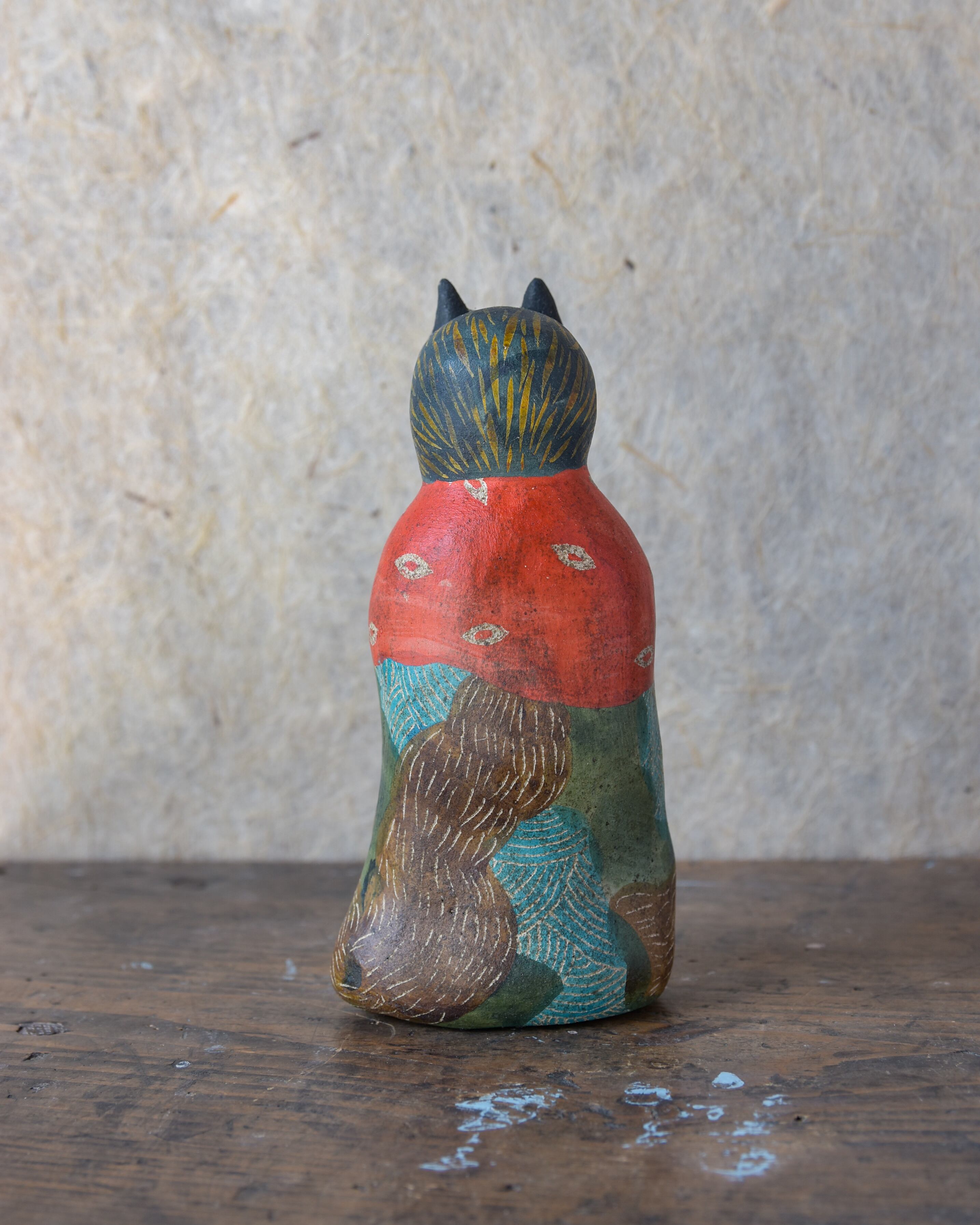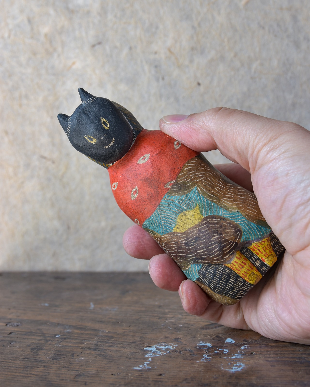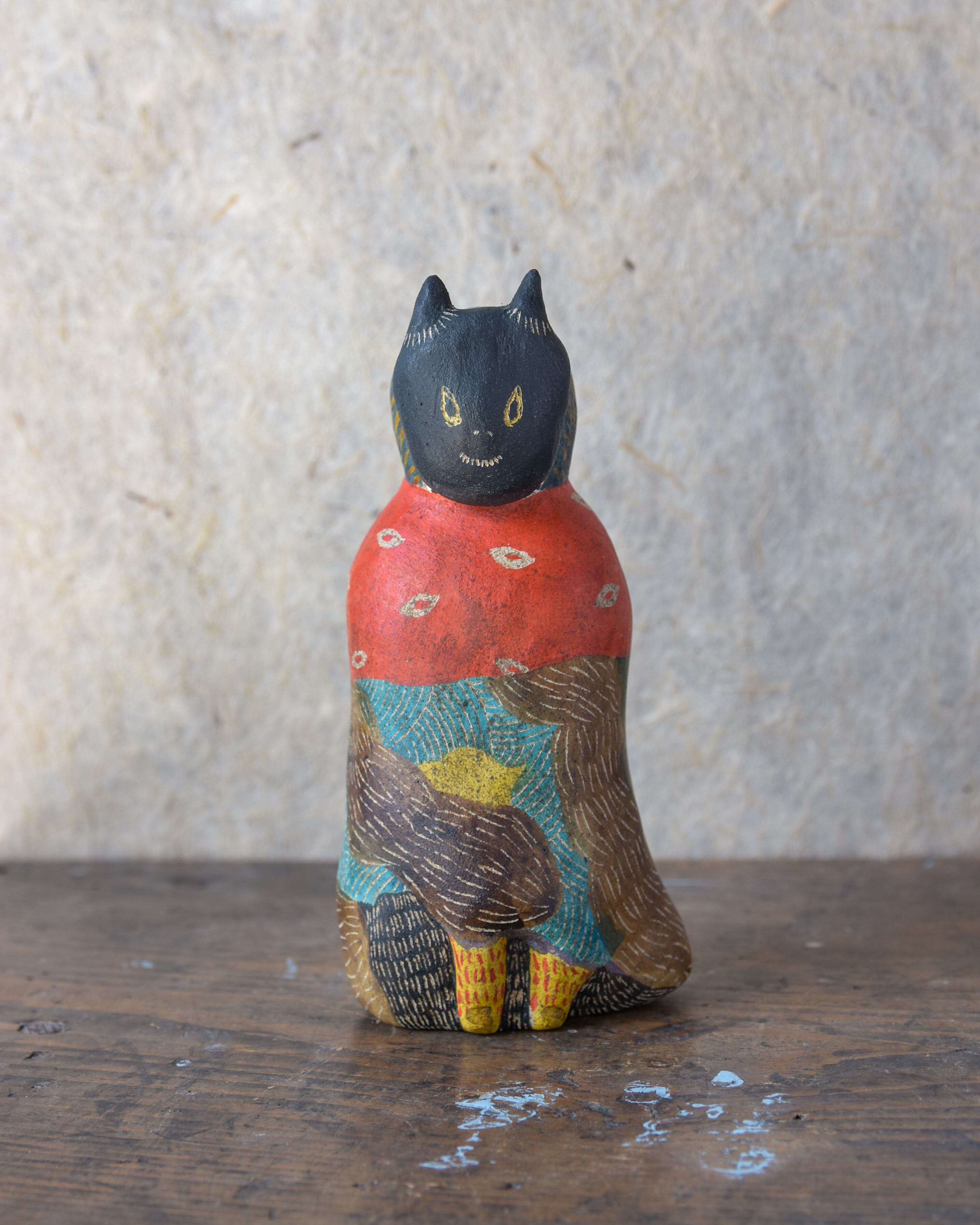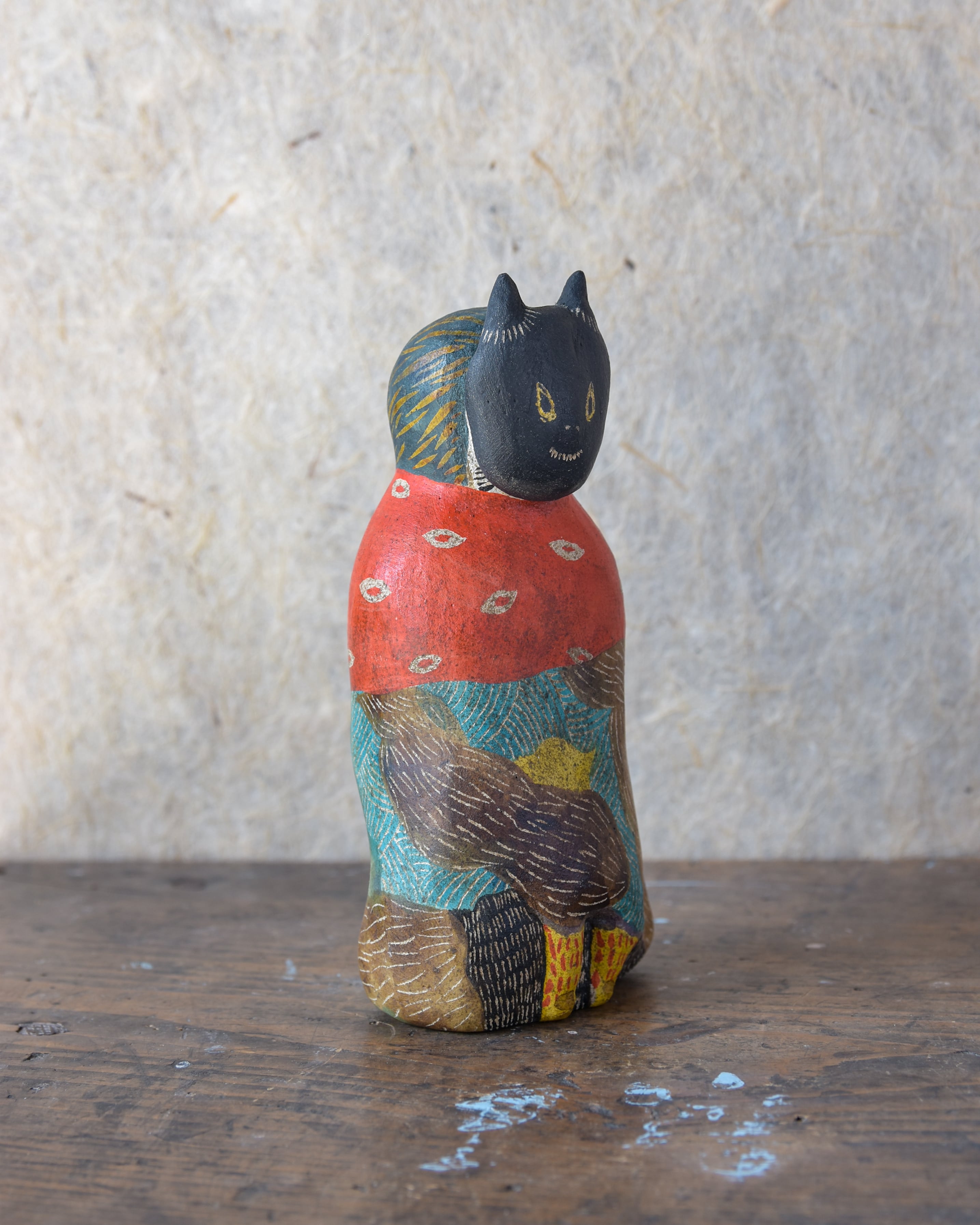 オーブン陶土で造形後、焼成し、絵を描く際と同じ画材を用いて彩色、削りを入れ完成させたオリジナル土人形です。