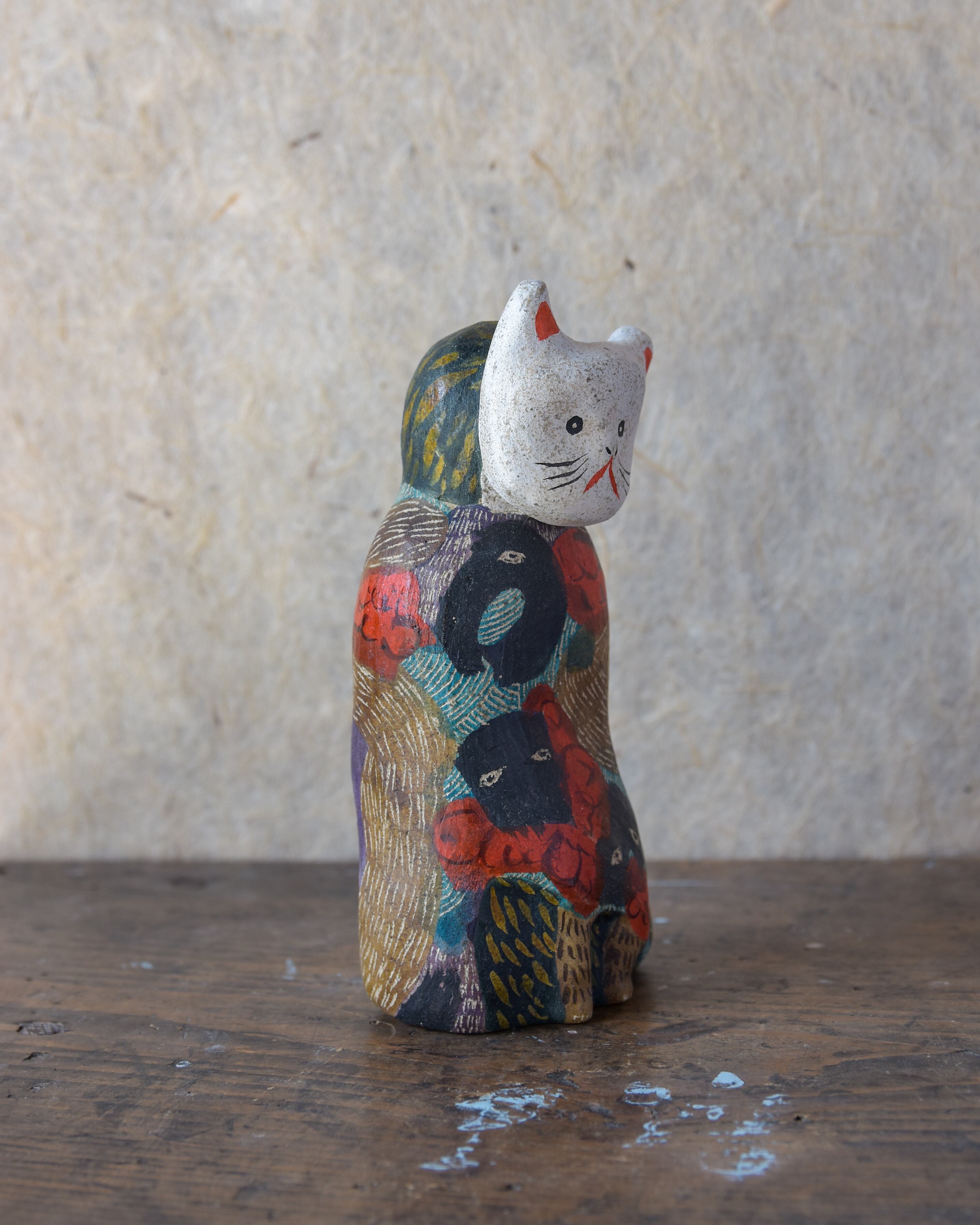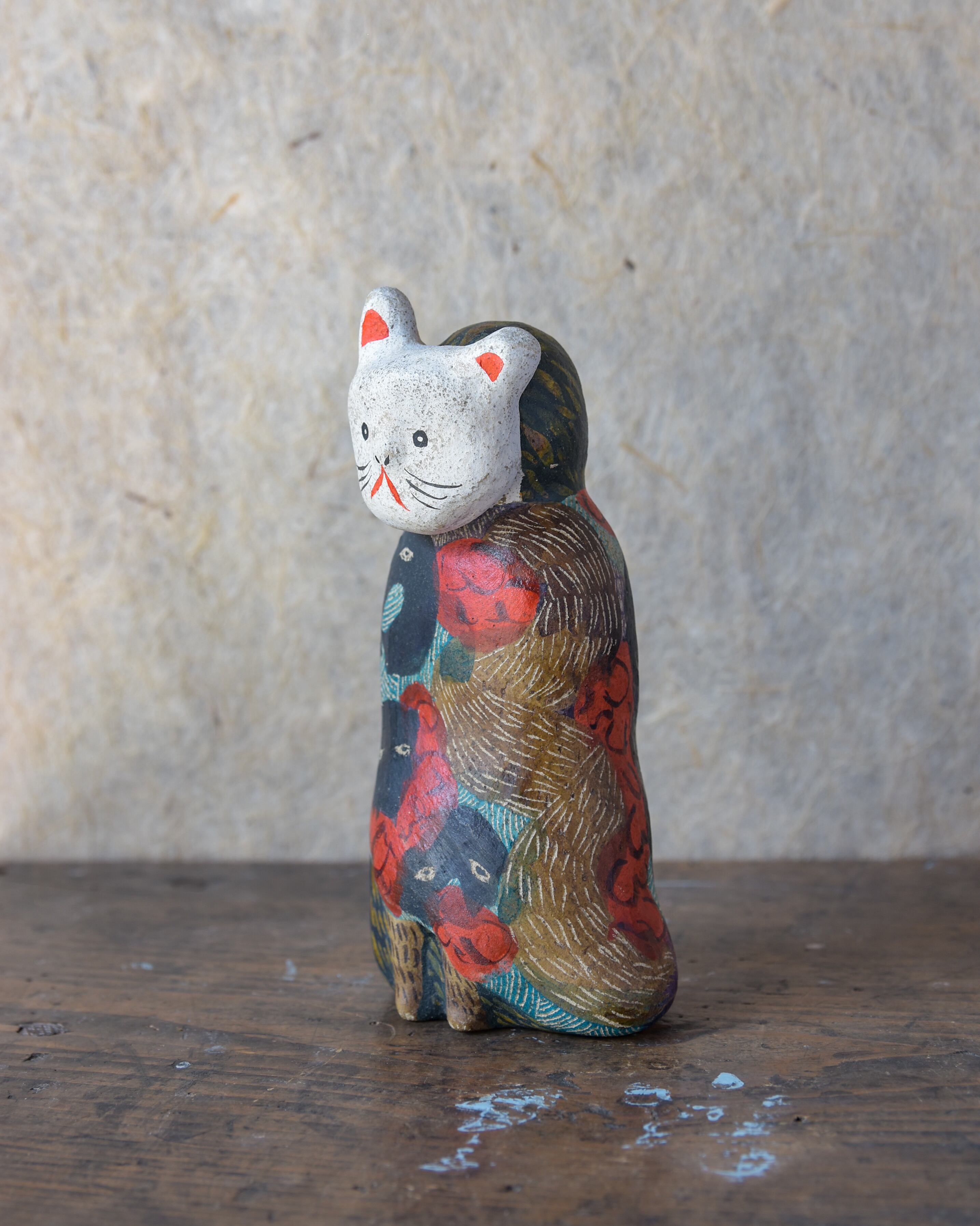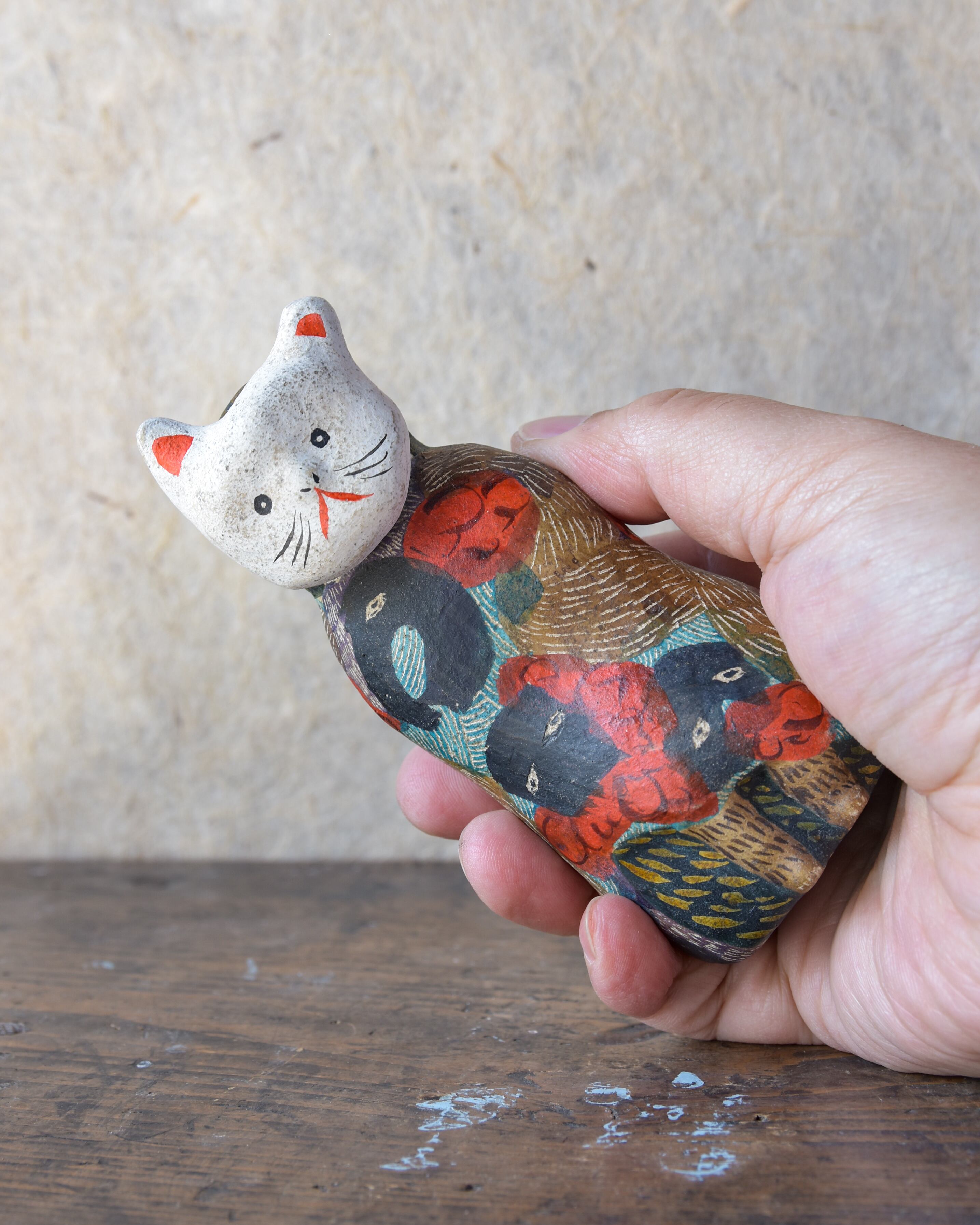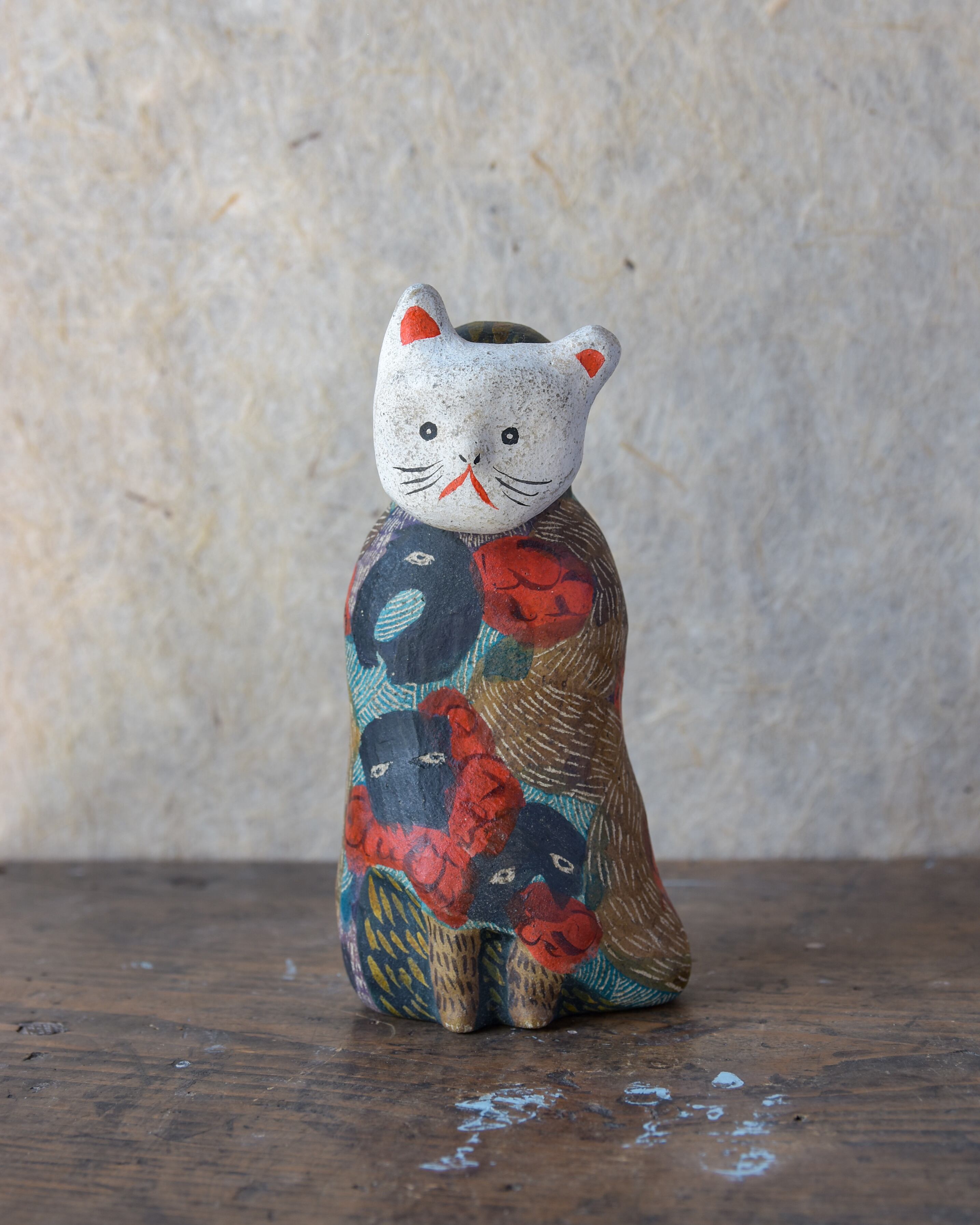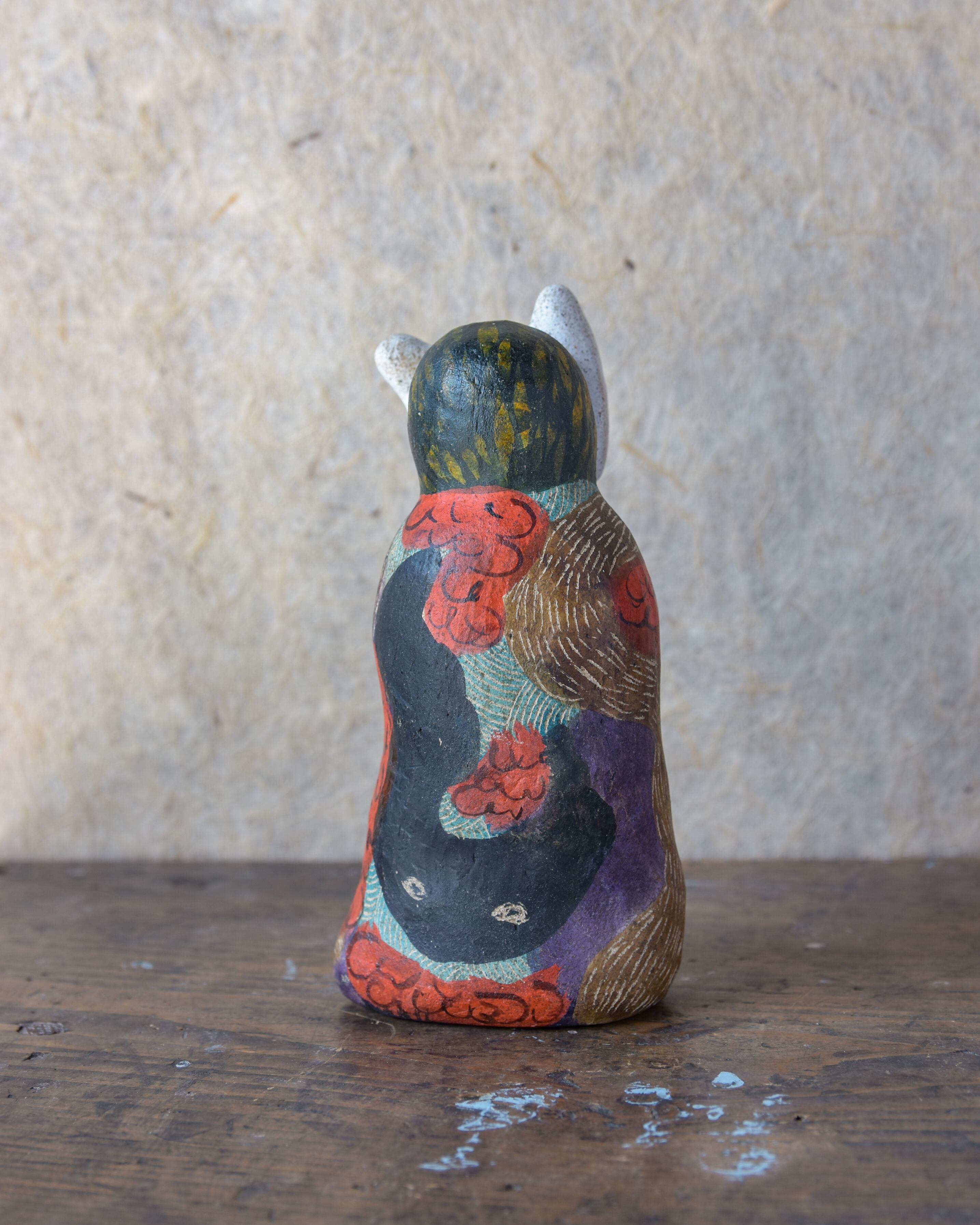 オーブン陶土で造形後、焼成し、絵を描く際と同じ画材を用いて彩色、削りを入れ完成させたオリジナル土人形です。