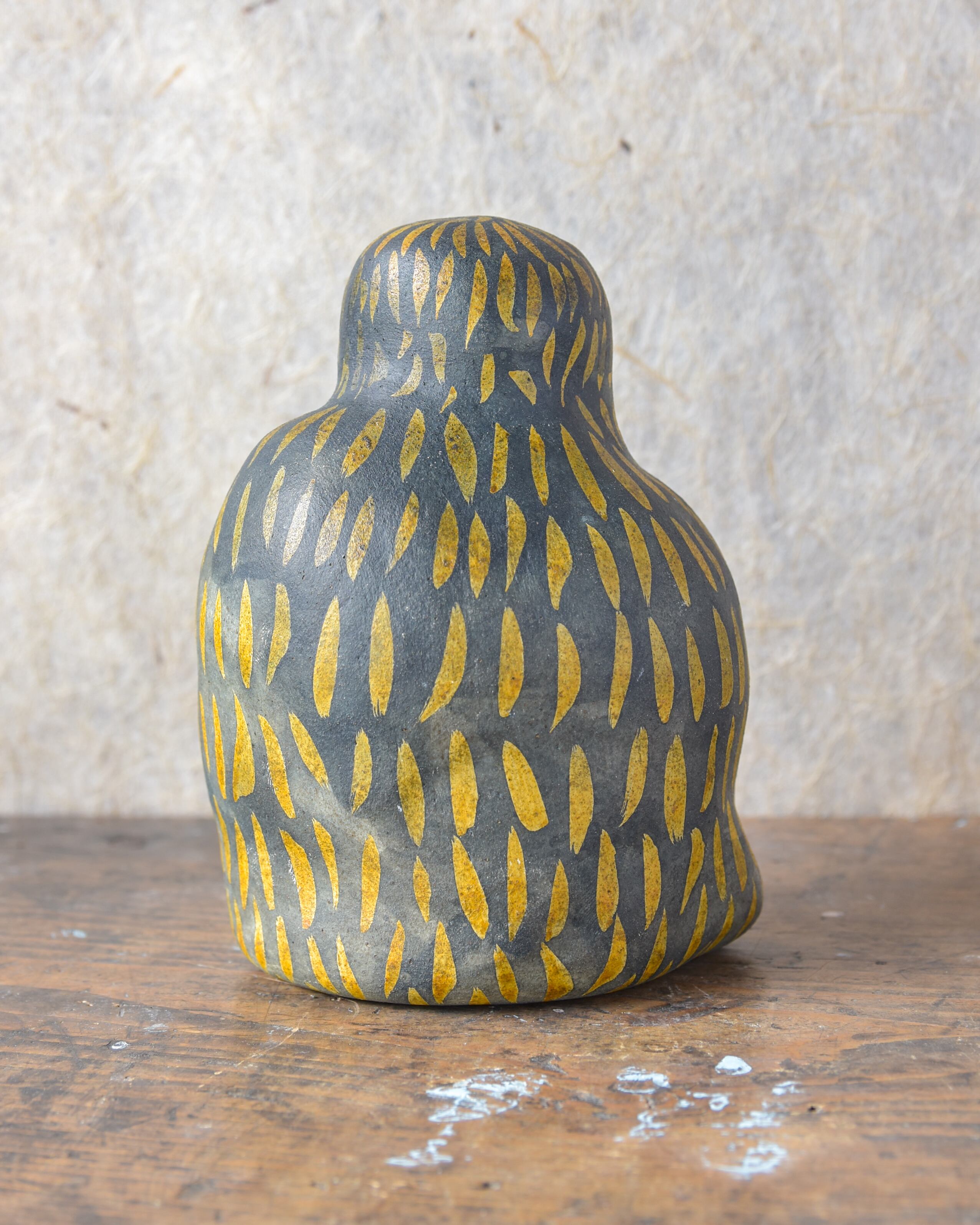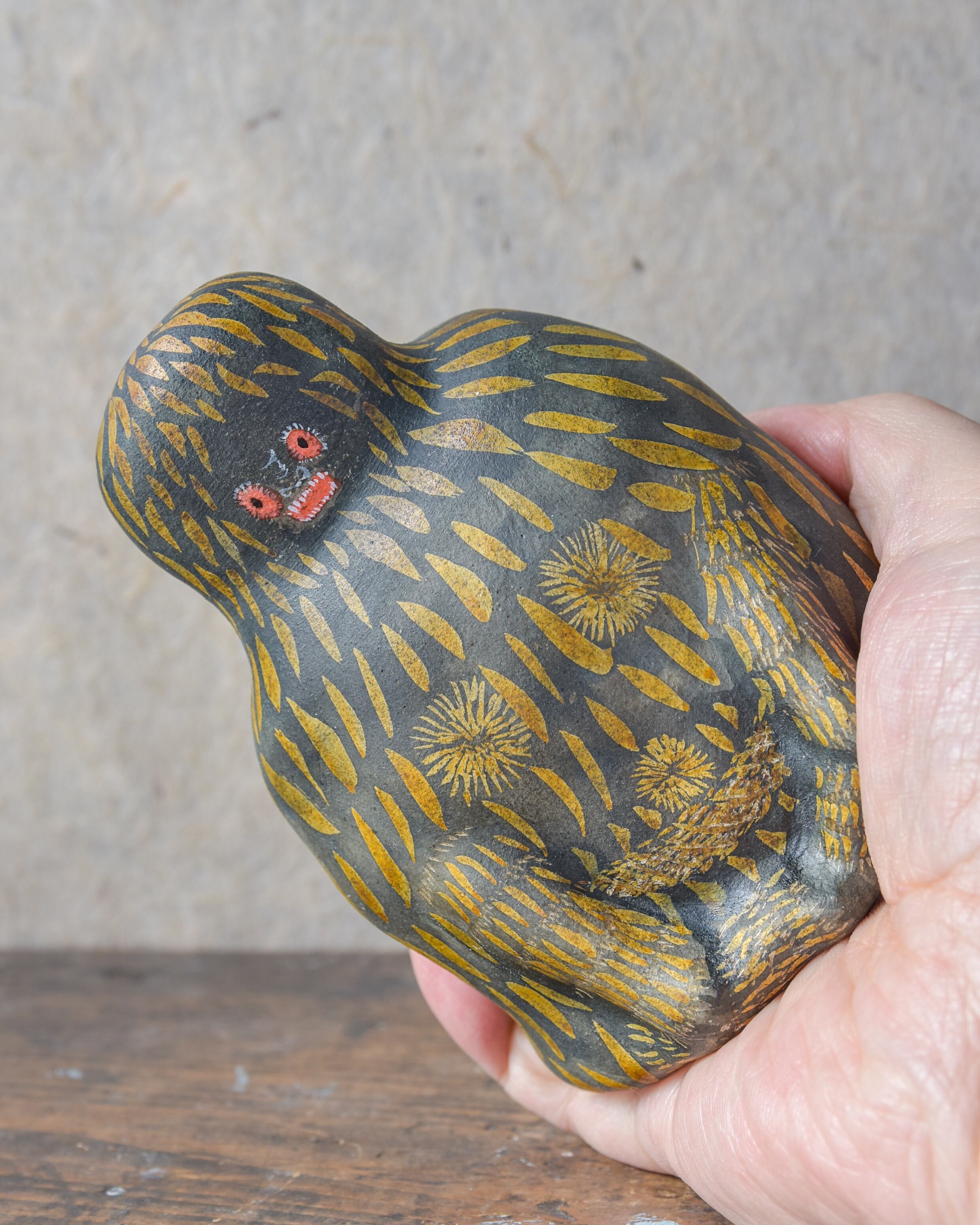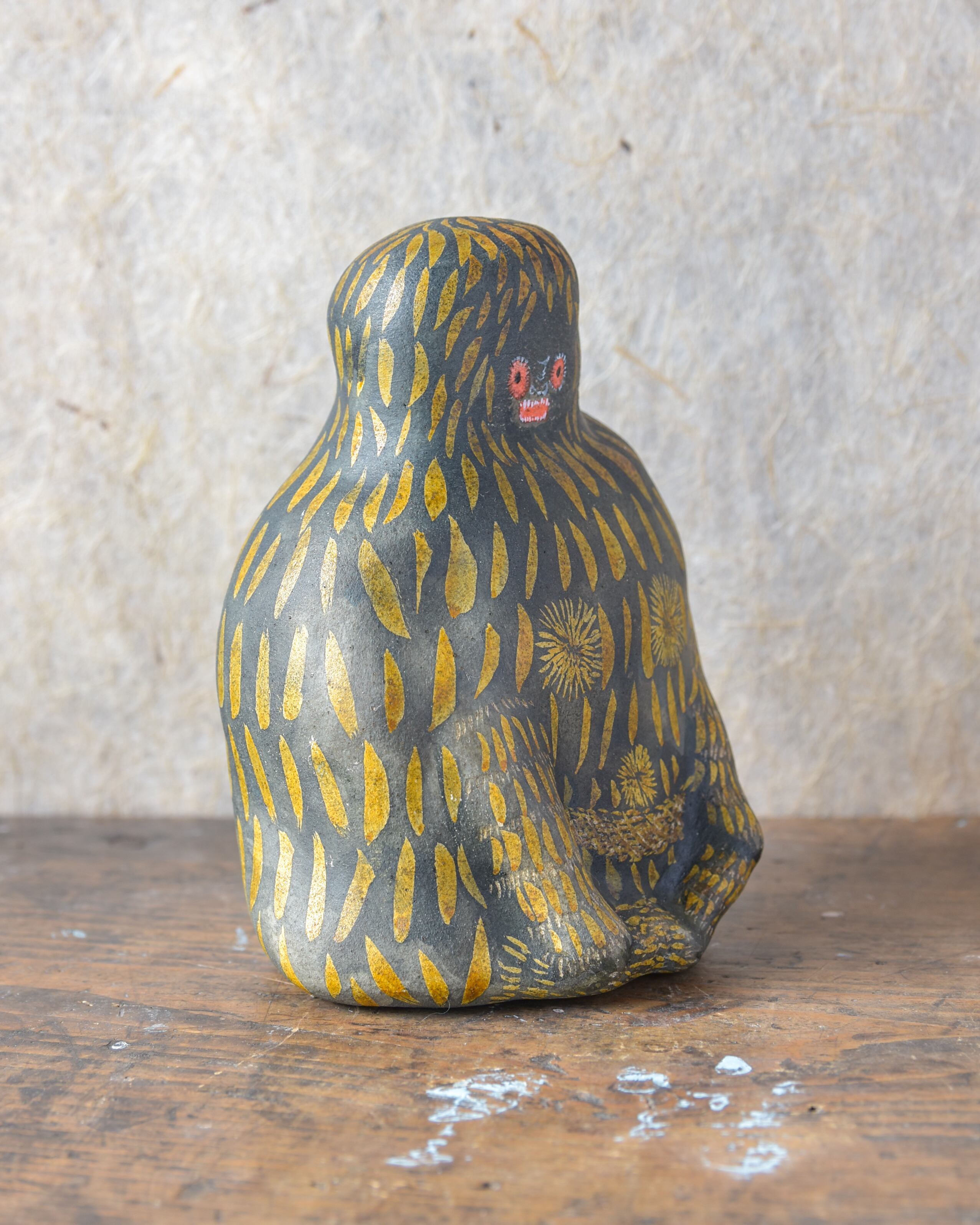 オーブン陶土で造形後、焼成し、絵を描く際と同じ画材を用いて彩色、削りを入れ完成させたオリジナル土人形です。